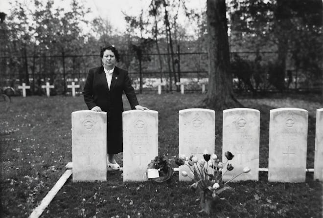 Een moeder van een van de omgekomen crewleden bij de graven tijdens een bezoek in 1956.