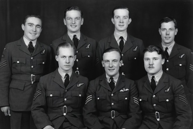 Vooraan v.l.n.r.: Winston Reid, piloot Eric Braddock en Ronald Putt, achteraan: John Booker, Gerald Hadfield, Ernest Finch en Eric Zaccheo