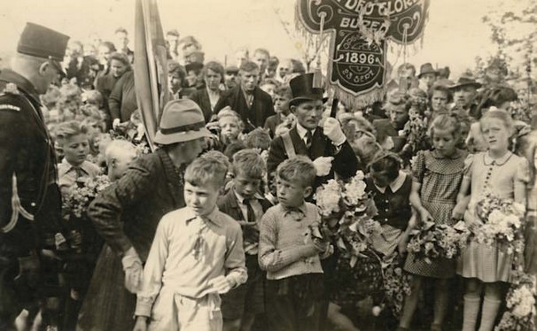 v.l.n.r. Mevr. Knobbout, weduwe van de burgemeester, aannemer Bas van Stuivenberg, de pastoor, de dominee Stein Callenfels met hogehoed en rechts veldwachter De Kruijff die de bevolking op afstand houdt.