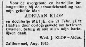 Adriaan Klop was getrouwd met Jantje Aldus. Jantje en haar vader verbleven in het achterhuis en werden niet geraakt. Op één na werden alle slachtoffers direct gedood. De jongste van hen, Simon die zwaargewond was, is - zo wordt verteld - nog naar de buren gekropen, maar hij stierf in de armen van zijn buurvrouw Lena van Woerkum-Nijhof.