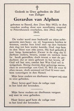 De overlijdensakte van Gerard is opgemaakt op 4 november 1947 in het Duitse Petershausen. Op 29 december 1947 deden zijn ouders hiervan aangifte in Heiloo, Noord-Holland.