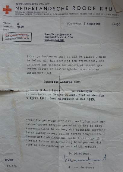 Hiernaaststaande tekst is afkomstig uit een schrijven van het Nederlandsche Roode Kruis, gedateerd 2 augustus 1950 en gericht aan Fam. Brus-Koemans, Dwarsstraat A. 354 te Geldermalsen.