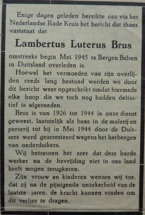 Overlijdensadvertentie van zijn werkgever in het personeelsblad van de Chamotteunie.