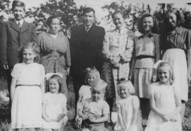 Foto van familie Van Wamel rond 1948 met boven v.l.n.r.: Warend, zuster van vader, vader Bernardus, moeder Wilhemina, twee onbekenden. Onder Gerrie, vriendinnetje, Willy, Nars, Marietje en vriendinnetje