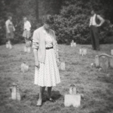 Gerrie bij het graf van Jan. Ouders en zus op de achtergrond. (Bron: G. van Tuil)