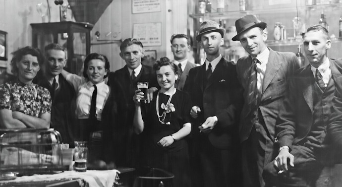 v.l.n.r. :Willemien, ? , Gerdien, Leen Nout en tweede van rechts Jo van Ommeren, vermoedelijk met vrienden en familie in een café in of nabij Zoelmond